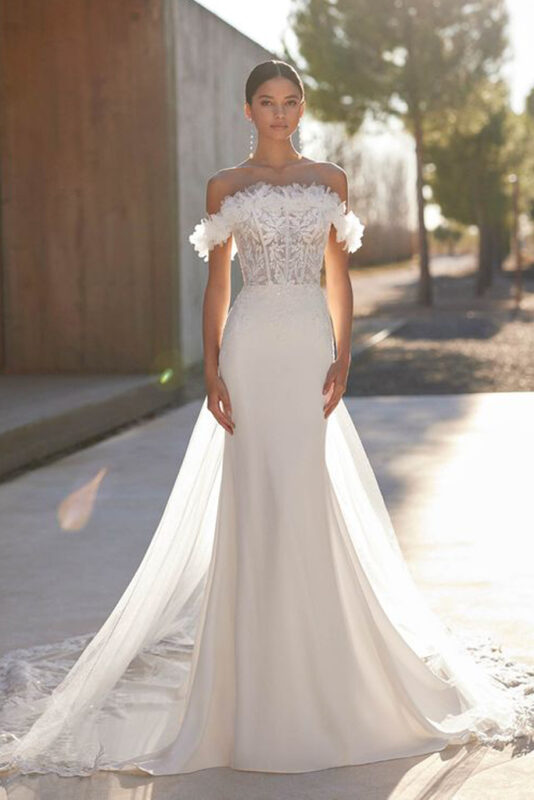 Sofisticado vestido de novia sirena, confeccionado en crepé elástico combinado con delicados apliques de encaje y pedrería que aportan textura y un brillo sutil. Su escote palabra de honor realza el busto con elegancia, mientras que el cuerpo estructurado estiliza la silueta con feminidad.