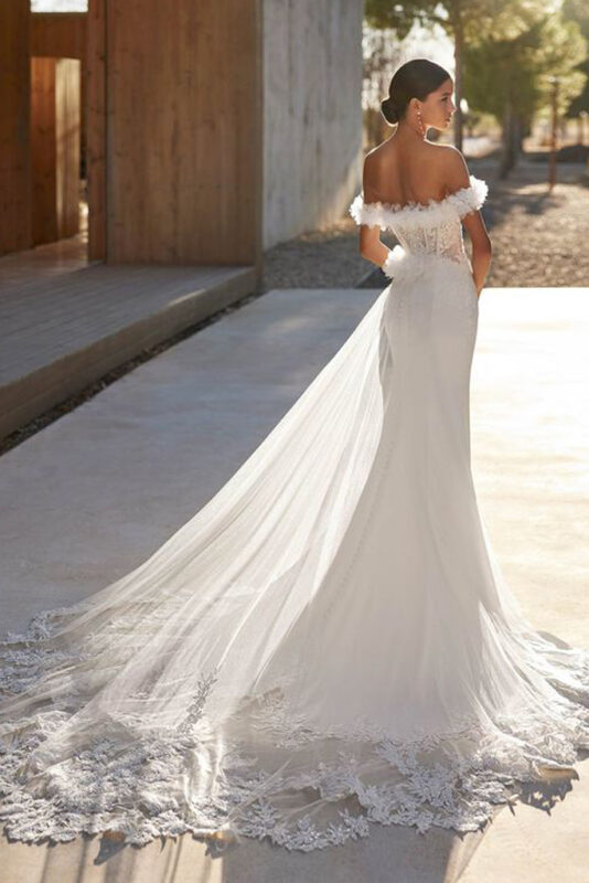 Sofisticado vestido de novia sirena, confeccionado en mikado de seda con escote palabra de honor que enmarca con sutileza los hombros y el escote, evocando elegancia y feminidad. Su silueta clásica resalta la figura, mientras los delicados bordados florales en transparencias abrazan la espalda con un aire romántico y etéreo.