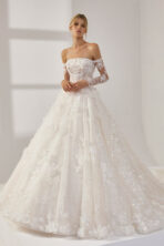 Espectacular vestido de novia estilo princesa, confeccionado en tul glitter con bordados y apliques florales en relieve. Su escote strapless tipo palabra de honor enmarca con elegancia el cuello y los hombros, mientras su corsé interno define la cintura a la perfección. Sus mangas estilo guantes aportan un toque romántico y versátil. Mientras que la falda voluminosa con destellos sutiles de brillo y una cola majestuosa evocan elegancia y fantasía.
