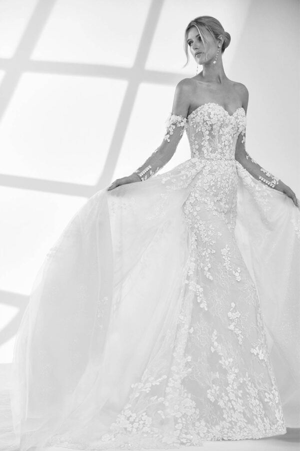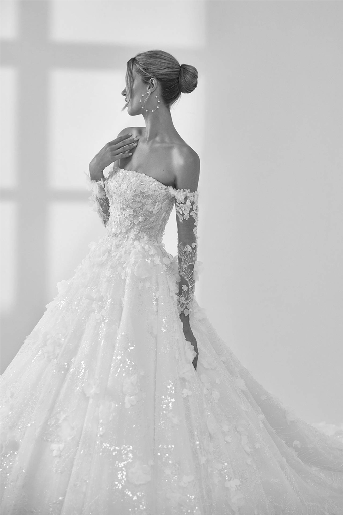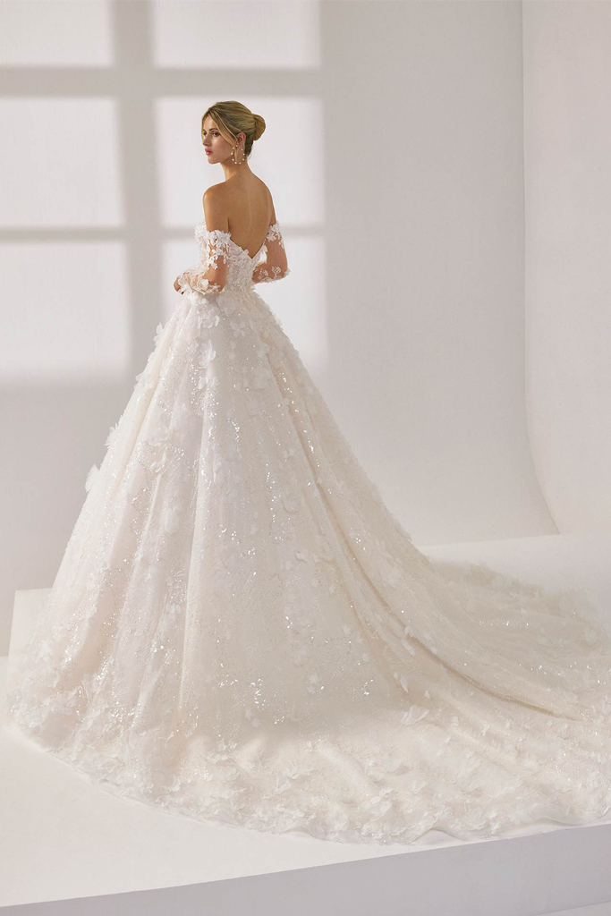 Espectacular vestido de novia estilo princesa, confeccionado en tul glitter con bordados y apliques florales en relieve. Su escote strapless tipo palabra de honor enmarca con elegancia el cuello y los hombros, mientras su corsé interno define la cintura a la perfección. Sus mangas estilo guantes aportan un toque romántico y versátil. Mientras que la falda voluminosa con destellos sutiles de brillo y una cola majestuosa evocan elegancia y fantasía.
