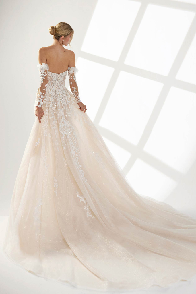 Deslumbrante vestido de novia corte silueta sirena y sobrefalda desmontable, confeccionado en tul bordado con delicados apliques florales tridimensionales. Su escote strapless realza el busto con elegancia, mientras que las mangas extraíbles decoradas con encaje añaden un toque romántico y sofisticado. La falda se ajusta suavemente hasta las caderas, abriéndose en una cola majestuosa que aporta movimiento y glamour. Perfecto para la novia que busca un look versátil, femenino y lleno de encanto.