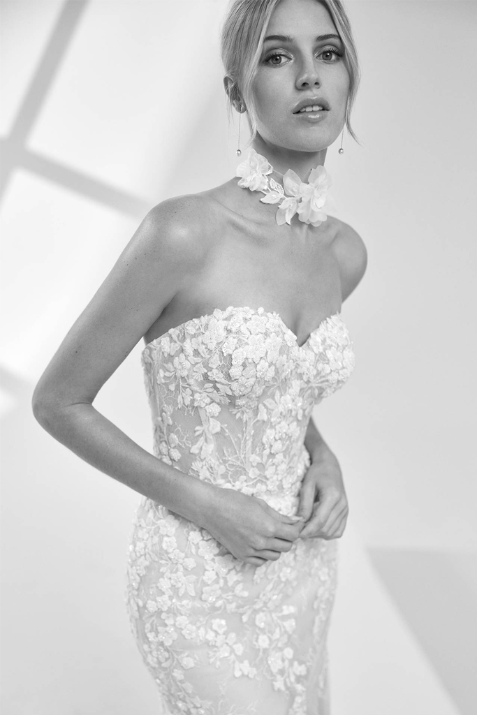 Deslumbrante vestido de novia corte silueta sirena y sobrefalda desmontable, confeccionado en tul bordado con delicados apliques florales tridimensionales. Su escote strapless realza el busto con elegancia, mientras que las mangas extraíbles decoradas con encaje añaden un toque romántico y sofisticado.