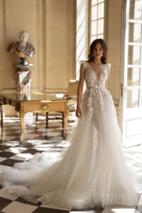 Espectacular vestido de novia línea A con escote en delantero y espalda llena de pedrería con una increíble cola.