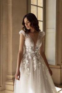 Lujoso vestido de novia línea A, con impactante brillo en su falda y fina pedrería en la parte superior, escote en V en el frente y costados que definen la cintura, espalda cubierta con pedrería.