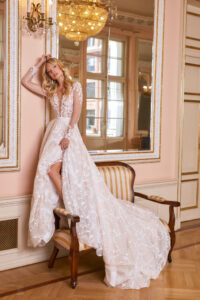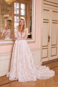 Increíble vestido de novia en línea A, tiene una hermosa ilusión que simula escote corazón en corpiño delantero, espalda en transparencia con romántico lazo en velo que cae, falda tono ivory en capas de tul decorado con encaje floral y pedrería.