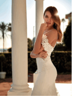 Sofisticado vestido de novia Sirena, confeccionado en crepé y delicados encajes florales que realzan la silueta con elegancia. Su escote en V profundo con efecto ilusión y finos tirantes con caída off-shoulder extraíbles aportan un toque romántico y femenino.