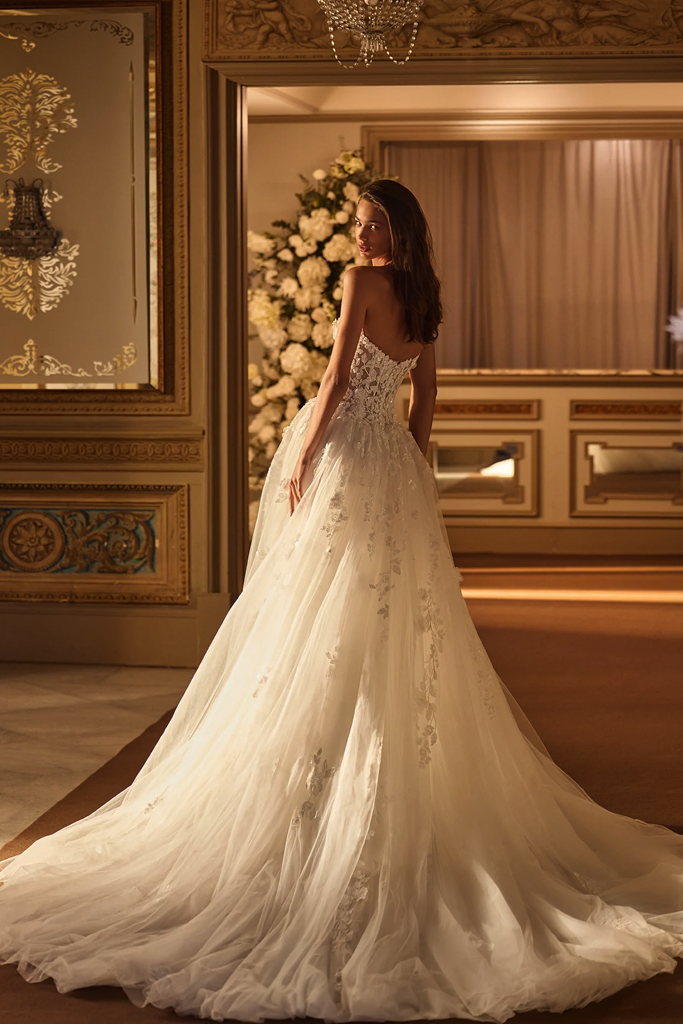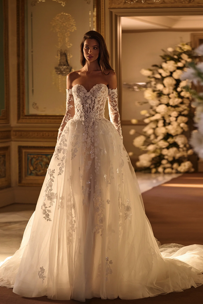 Hermoso vestido de novia estilo princesa, tipo corsé con escote corazón adornado con delicado encaje bordado en relieve. La falda de tul vaporoso crea un efecto de transparencia suave y movimiento etéreo, mientras que las mangas bordadas extraíbles permiten transformar el look entre clásico y moderno.