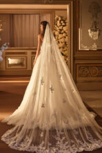 Hermoso vestido de novia estilo princesa, tipo corsé con escote corazón adornado con delicado encaje bordado en relieve. La falda de tul vaporoso crea un efecto de transparencia suave y movimiento etéreo, mientras que las mangas bordadas extraíbles permiten transformar el look entre clásico y moderno. Un diseño ideal para la novia que busca feminidad, fantasía y un encanto majestuoso en cada detalle.