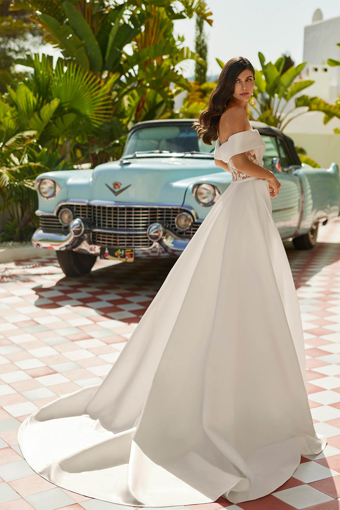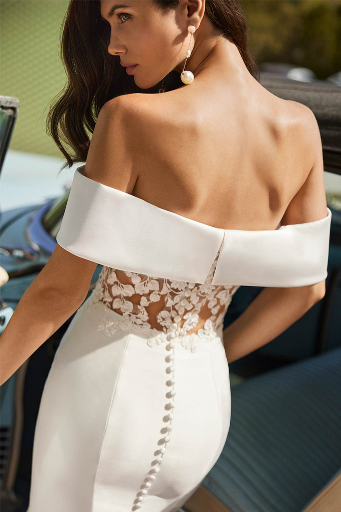 Sofisticado vestido de novia sirena, confeccionado en mikado de seda con escote palabra de honor que enmarca con sutileza los hombros y el escote, evocando elegancia y feminidad. Su silueta clásica resalta la figura, mientras los delicados bordados florales en transparencias abrazan la espalda con un aire romántico y etéreo. Su sobrefalda aporta un toque de majestuosidad y movimiento. Un diseño que combina elegancia, feminidad y encanto en cada detalle.