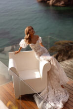Vestido de novia de silueta sirena confeccionado en delicado guipur con lentejuelas que aportan un brillo sutil y elegante. Su diseño realza la figura con una caída fluida y femenina, mientras que las mangas abullonadas extraíbles en tul añaden un toque romántico y versátil al look. Un vestido que combina sensualidad, sofisticación y ligereza en perfecta armonía.