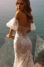 Vestido de novia de silueta sirena confeccionado en delicado guipur con lentejuelas que aportan un brillo sutil y elegante. Su diseño realza la figura con una caída fluida y femenina, mientras que las mangas abullonadas extraíbles en tul añaden un toque romántico y versátil al look.