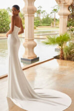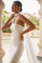 Sofisticado vestido de novia sirena, con escote strapless tipo palabra de honor que realza cuello y hombros. Está diseñado para acentuar la cintura con una silueta impecable que se adapta a cada curva. Acompañado de un increíble choker desmontable que apuesta por una caída sofisticada y elegante.