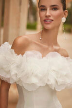 Sofisticado vestido de novia línea A, confeccionado en mikado con escote strapless palabra de honor, ideal para realzar el porte y la elegancia de la novia. Su diseño incluye delicadas flores desmontables que abrazan suavemente los brazos, permitiendo transformar el look entre un estilo clásico y un toque romántico y femenino. Perfecto para quien busca un estilo limpio, refinado y atemporal.