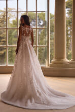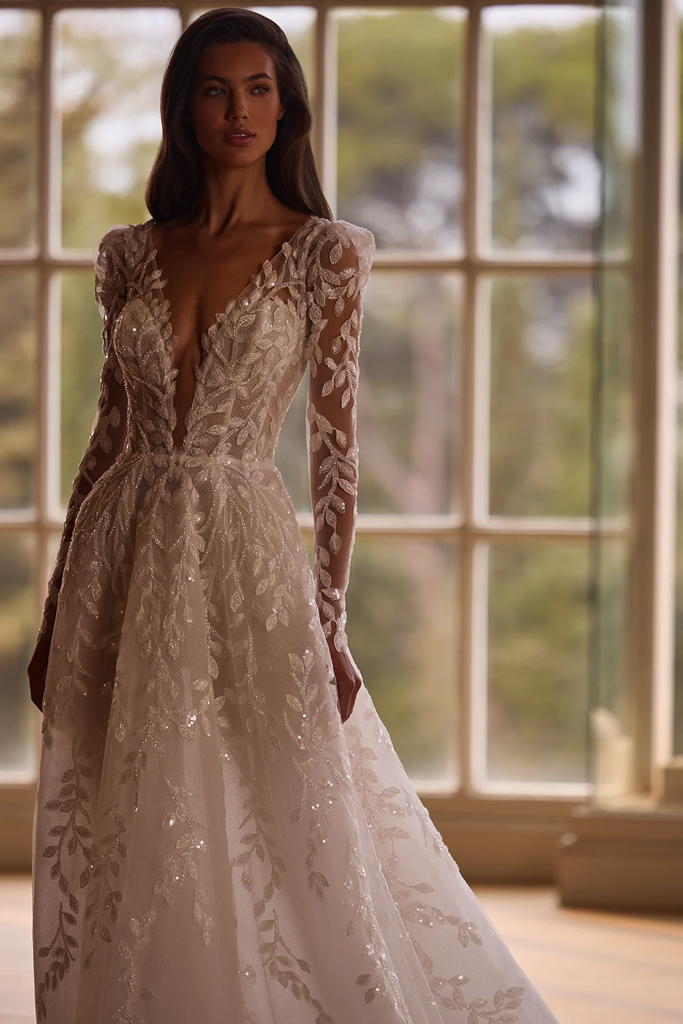 Sofisticado vestido de novia línea A, confeccionado en tul con delicados apliques florales bordados y sutiles destellos que aportan un brillo etéreo. Su escote en V profundo estiliza la figura, mientras las mangas largas desmontables permiten crear un doble look entre sofisticación y modernidad.