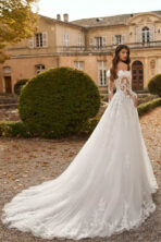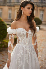 Romántico vestido de novia Linea A, en tul con delicados apliques florales en encaje y pedrería. Su escote corazón con efecto corset de escote profundo y mangas extraíbles aportan un aire femenino y etéreo. La falda vaporosa con cola larga y bordes decorados completa un look de ensueño, ideal para novias que buscan elegancia y sutileza con un toque de fantasía.