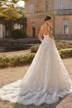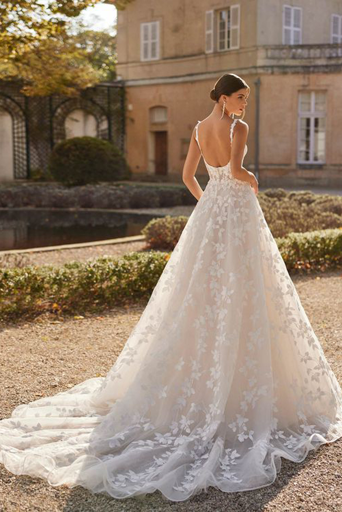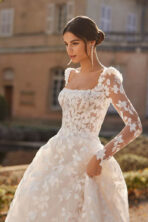 Vestido de novia línea A, con escote francés y una hermosa espalda descubierta, perfecto para novias románticas. Cuenta con delicados encajes que adornan la silueta de manera uniforme, aportando un encanto natural al diseño. Sus mangas extraibles lo complementan para que la novia pueda lucir dos looks diferentes con un solo vestido.